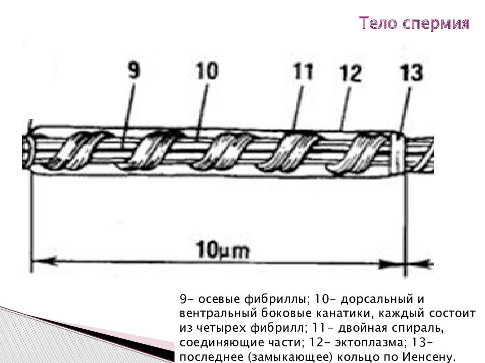 9- осевые фибриллы; 10- дорсальный и вентральный боковые канатики, каждый состоит из четырех фибрилл; 11- двойная спираль, соединяющие части; 12- эктоплазма; 13- последнее (замыкающее) кольцо по Иенсену. Тело спермия
