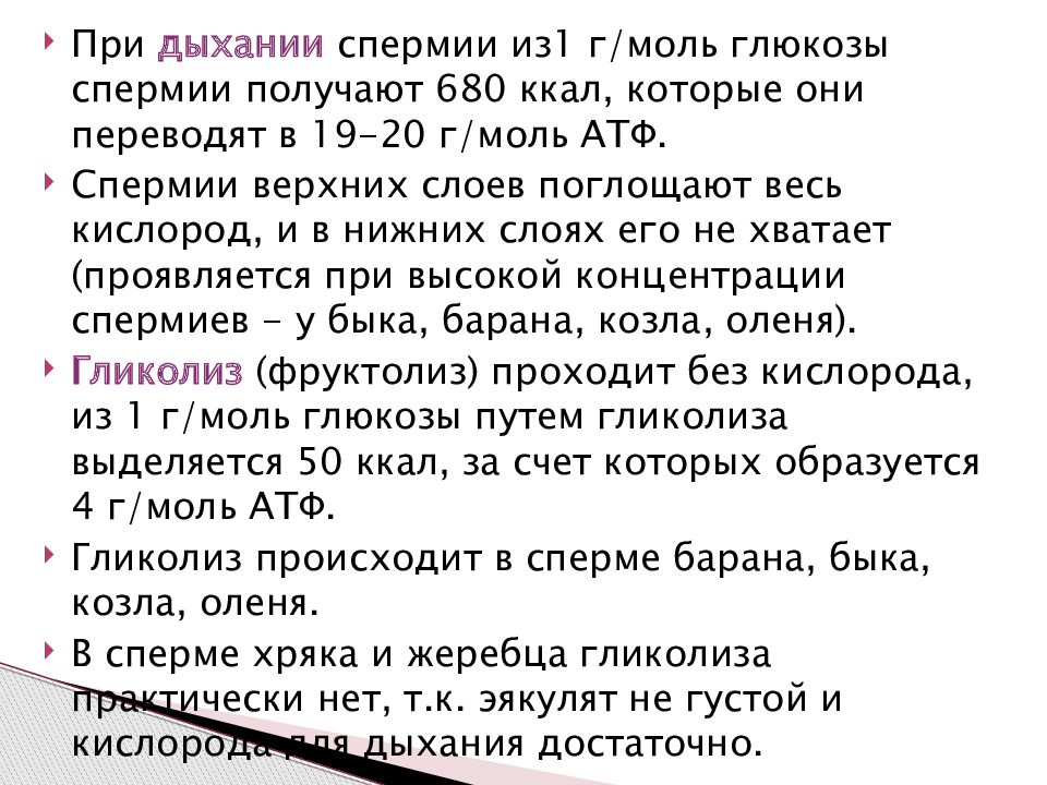При дыхании спермии из1 г/моль глюкозы спермии получают 680 ккал, которые они переводят в 19-20 г/моль АТФ. Спермии верхних слоев поглощают весь кислород, и в нижних слоях его не хватает (проявляется при высокой концентрации спермиев - у быка, барана, козла, оленя). Гликолиз ( фруктолиз ) проходит без кислорода, из 1 г/моль глюкозы путем гликолиза выделяется 50 ккал, за счет которых образуется 4 г/моль АТФ. Гликолиз происходит в сперме барана, быка, козла, оленя. В сперме хряка и жеребца гликолиза практически нет, т.к. эякулят не густой и кислорода для дыхания достаточно.