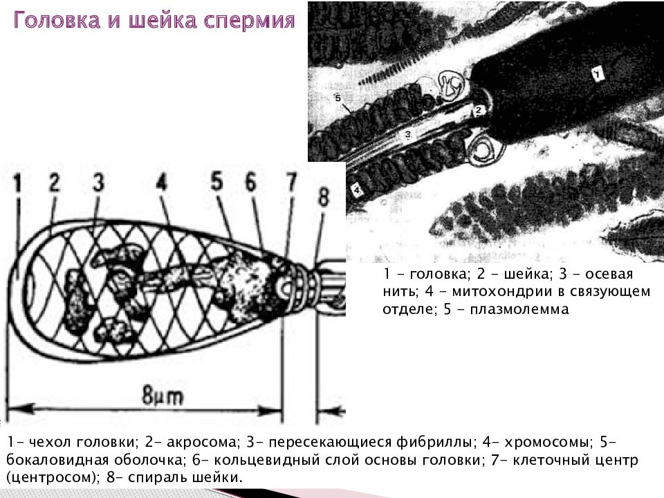 1- чехол головки; 2- акросома ; 3- пересекающиеся фибриллы; 4- хромосомы; 5- бокаловидная оболочка; 6- кольцевидный слой основы головки; 7- клеточный центр (центросом); 8- спираль шейки. Головка и шейка спермия 1 - головка; 2 - шейка; 3 - осевая нить; 4 - митохондрии в связующем отделе; 5 - плазмолемма