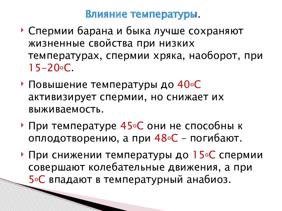 Влияние температуры. Спермии барана и быка лучше сохраняют жизненные свойства при низких температурах, спермии хряка, наоборот, при 15-20 о С. Повышение температуры до 40 о С активизирует спермии, но снижает их выживаемость. При температуре 45 о С они не способны к оплодотворению, а при 48 о С – погибают. При снижении температуры до 15 о С спермии совершают колебательные движения, а при 5 о С впадают в температурный анабиоз.