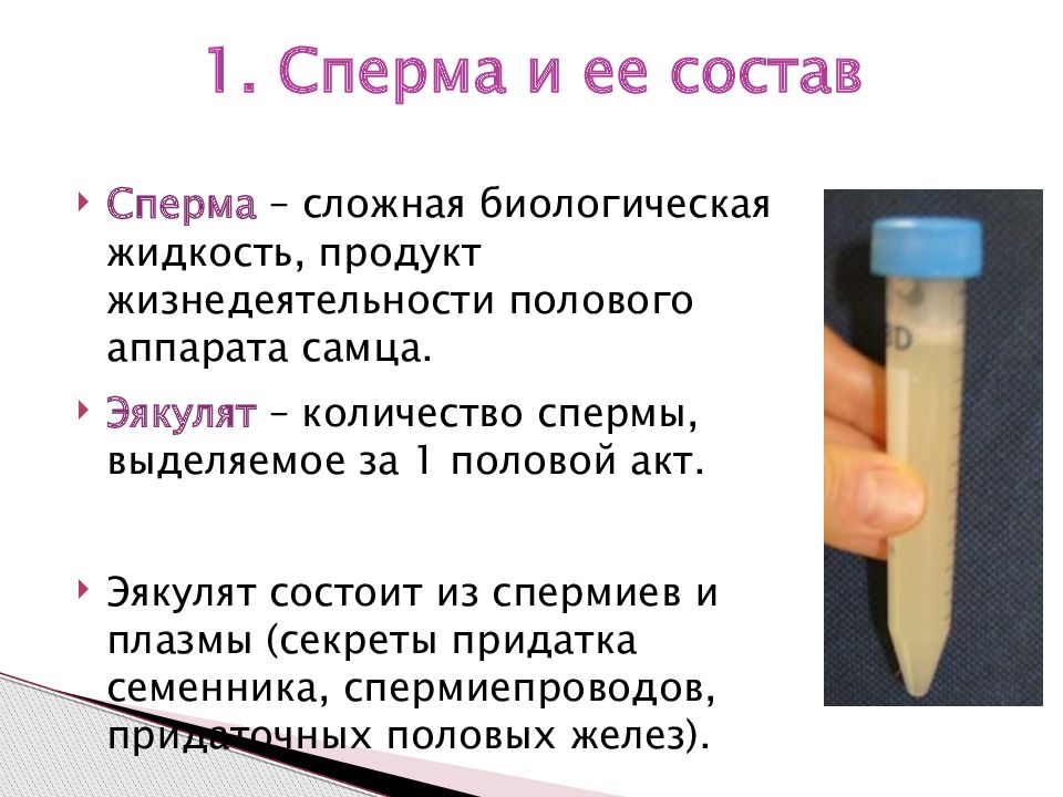 Сперма – сложная биологическая жидкость, продукт жизнедеятельности полового аппарата самца. Эякулят – количество спермы, выделяемое за 1 половой акт. Эякулят состоит из спермиев и плазмы (секреты придатка семенника, спермиепроводов, придаточных половых желез). 1. Сперма и ее состав