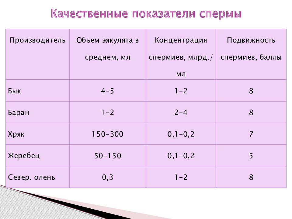 Производитель Объем эякулята в среднем, мл Концентрация спермиев, млрд./мл Подвижность спермиев, баллы Бык 4-5 1-2 8 Баран 1-2 2-4 8 Хряк 150-300 0,1-0,2 7 Жеребец 50-150 0,1-0,2 5 Север. олень 0,3 1-2 8