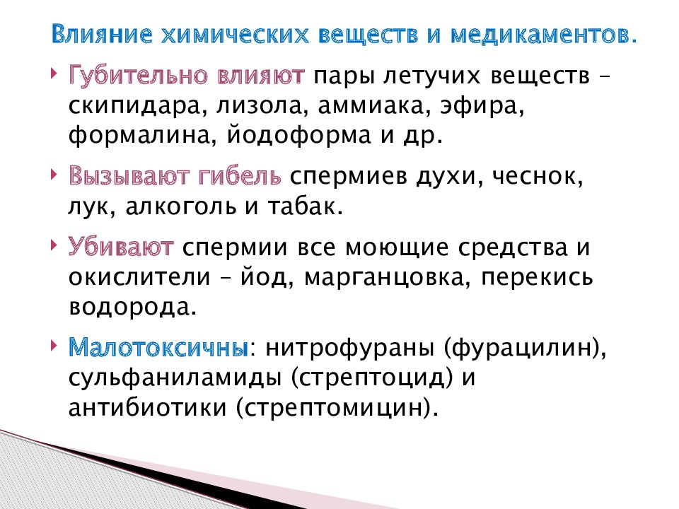 Влияние химических веществ и медикаментов. Губительно влияют пары летучих веществ – скипидара, лизола, аммиака, эфира, формалина, йодоформа и др. Вызывают гибель спермиев духи, чеснок, лук, алкоголь и табак. Убивают спермии все моющие средства и окислители – йод, марганцовка, перекись водорода. Малотоксичны : нитрофураны (фурацилин), сульфаниламиды (стрептоцид) и антибиотики (стрептомицин ).