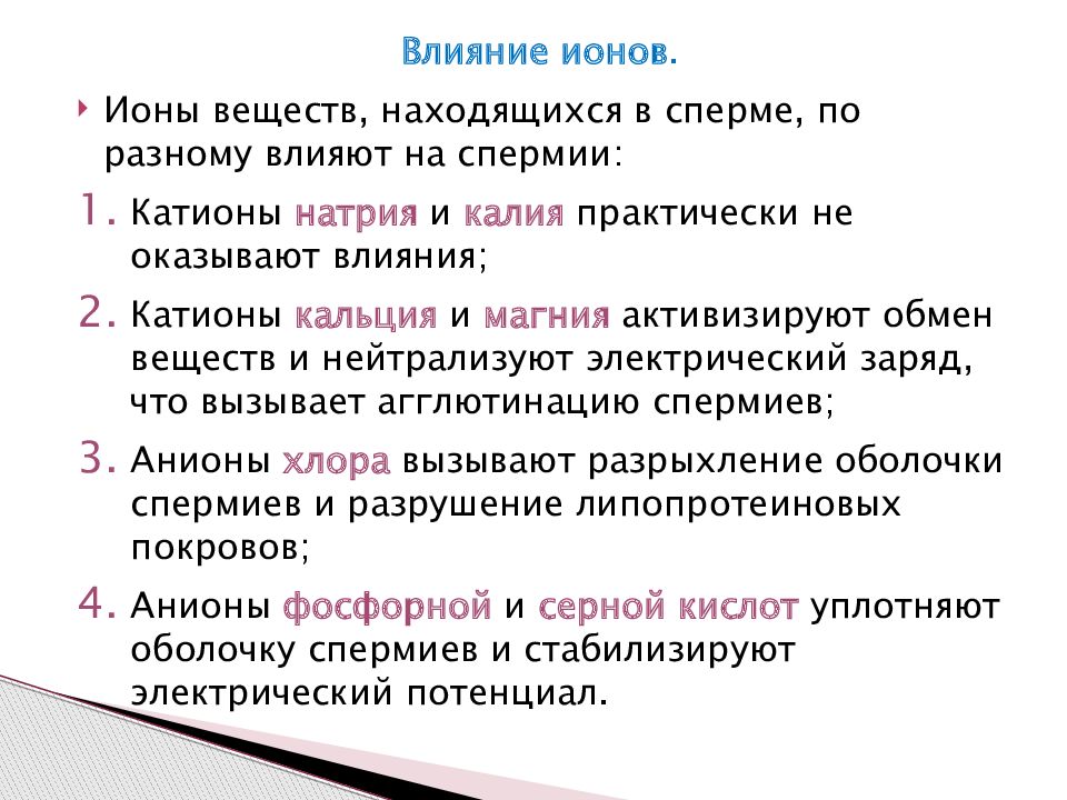Влияние ионов. Ионы веществ, находящихся в сперме, по разному влияют на спермии: Катионы натрия и калия практически не оказывают влияния; Катионы кальция и магния активизируют обмен веществ и нейтрализуют электрический заряд, что вызывает агглютинацию спермиев; Анионы хлора вызывают разрыхление оболочки спермиев и разрушение липопротеиновых покровов; Анионы фосфорной и серной кислот уплотняют оболочку спермиев и стабилизируют электрический потенциал.