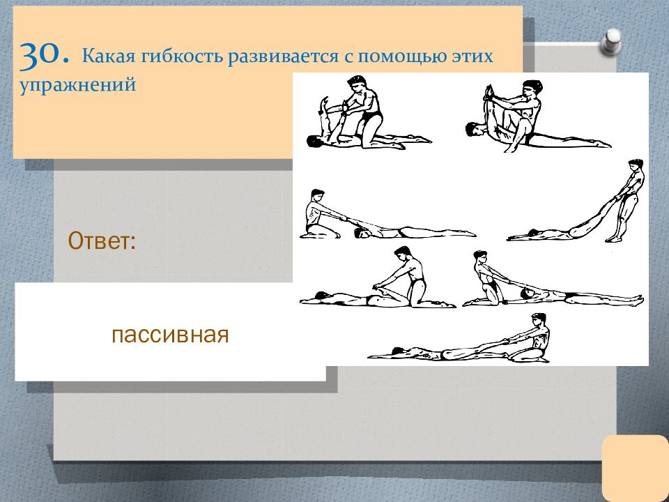 Слайд 16: 30. Какая гибкость развивается с помощью этих упражнений