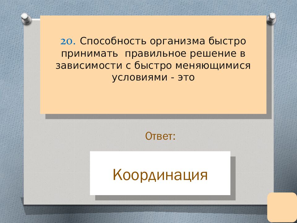 Слайд 4: 20. Способность организма быстро принимать правильное решение в зависимости с быстро меняющимися условиями - это