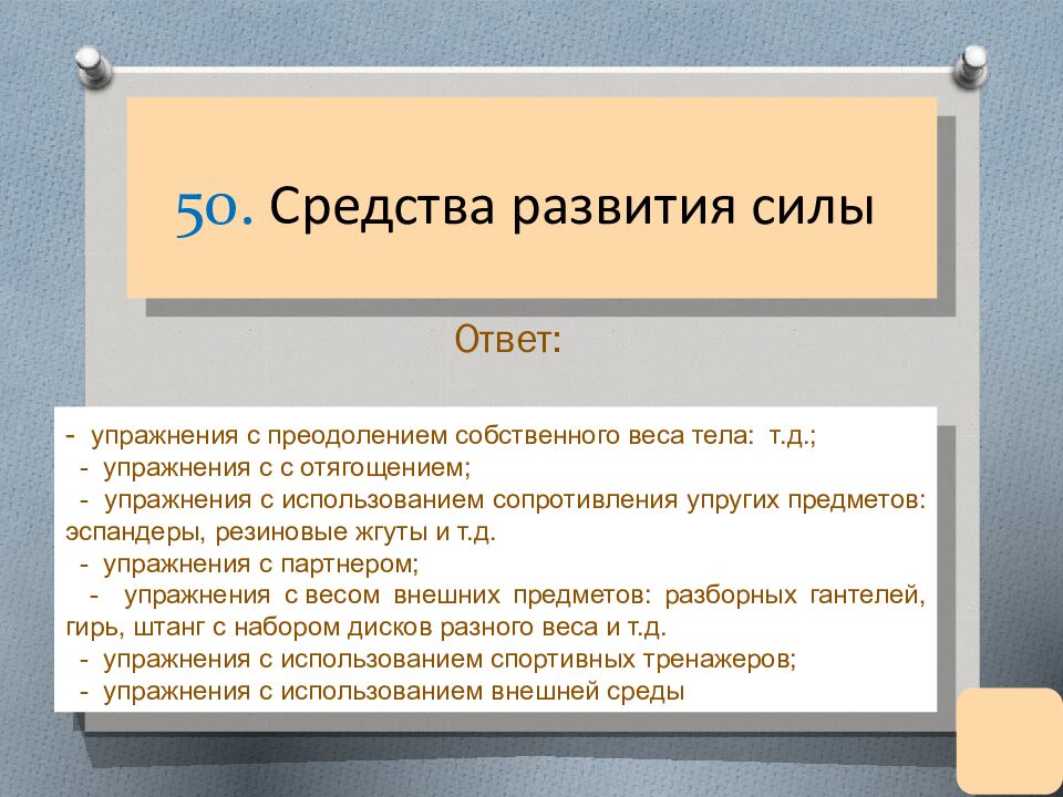 Ответ: - упражнения с преодолением собственного веса тела: т.д.; - упражнения с с отягощением; - упражнения с использованием сопротивления упругих предметов: эспандеры, резиновые жгуты и т.д. - упражнения с партнером; - упражнения с весом внешних предметов: разборных гантелей, гирь, штанг с набором дисков разного веса и т.д. - упражнения с использованием спортивных тренажеров; - упражнения с использованием внешней среды