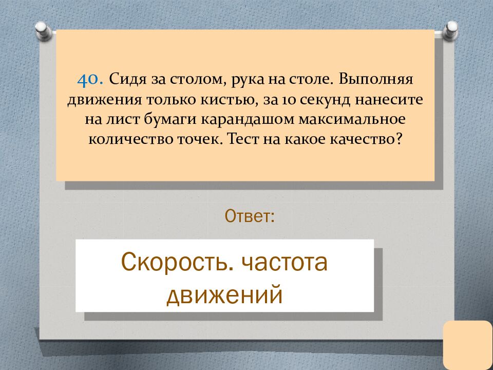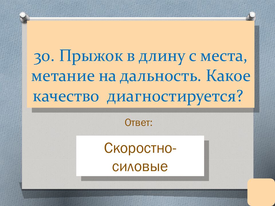 Слайд 11: 30. Прыжок в длину с места, метание на дальность. Какое качество диагностируется?