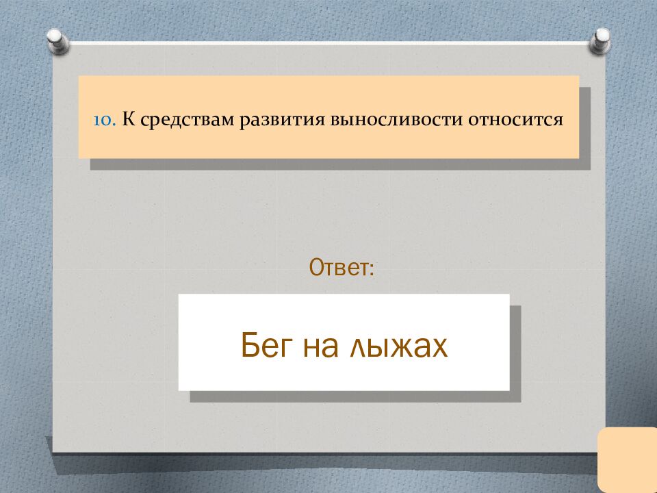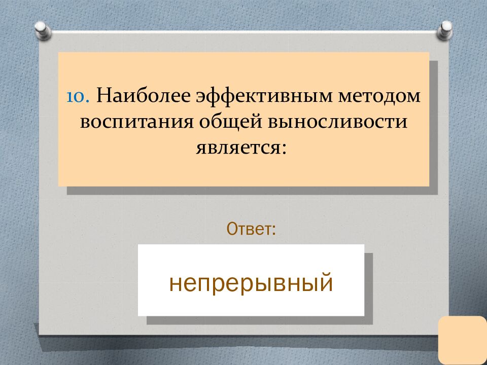 Слайд 19: 10. Наиболее эффективным методом воспитания общей выносливости является:
