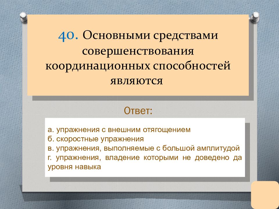 Слайд 17: 40. Основными средствами совершенствования координационных способностей являются