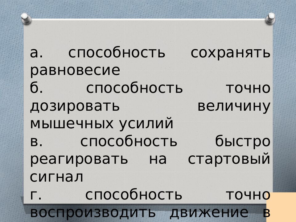 а. способность сохранять равновесие б. способность точно дозировать величину мышечных усилий в. способность быстро реагировать на стартовый сигнал г. способность точно воспроизводить движение в пространстве