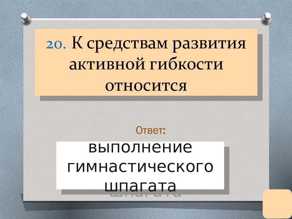 Слайд 15: 20. К средствам развития активной гибкости относится