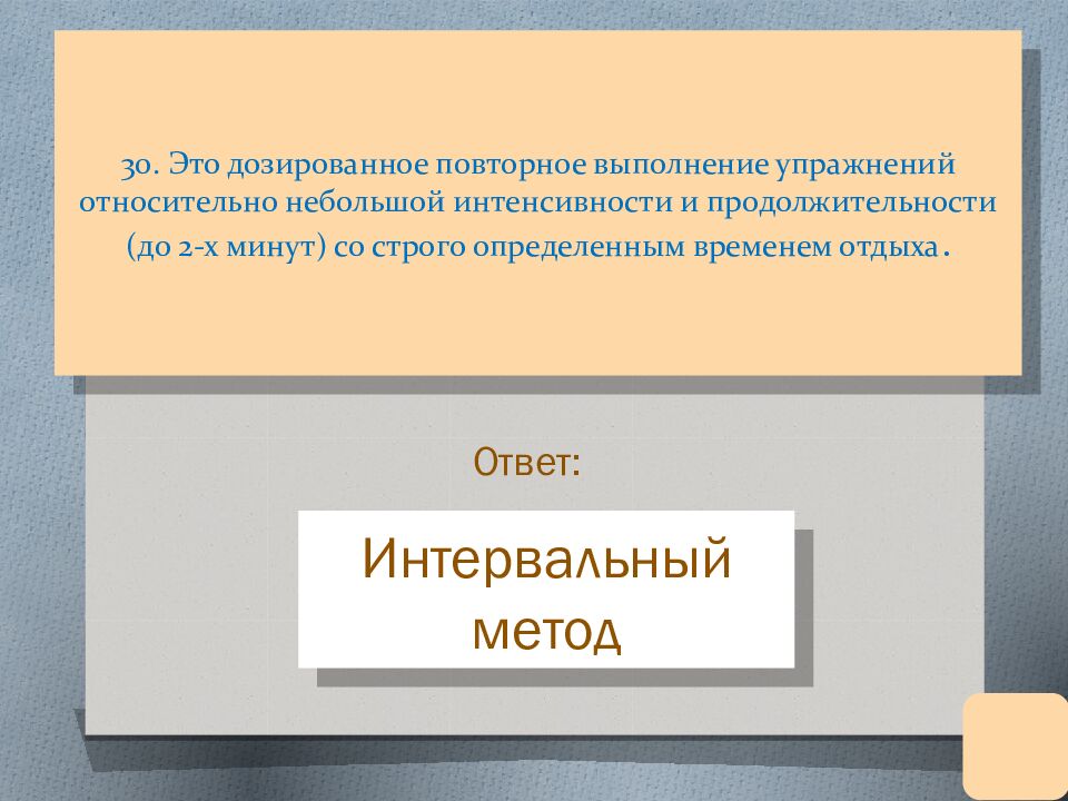 Слайд 21: 30. Это дозированное повторное выполнение упражнений относительно небольшой интенсивности и продолжительности (до 2-х минут) со строго определенным временем отдыха