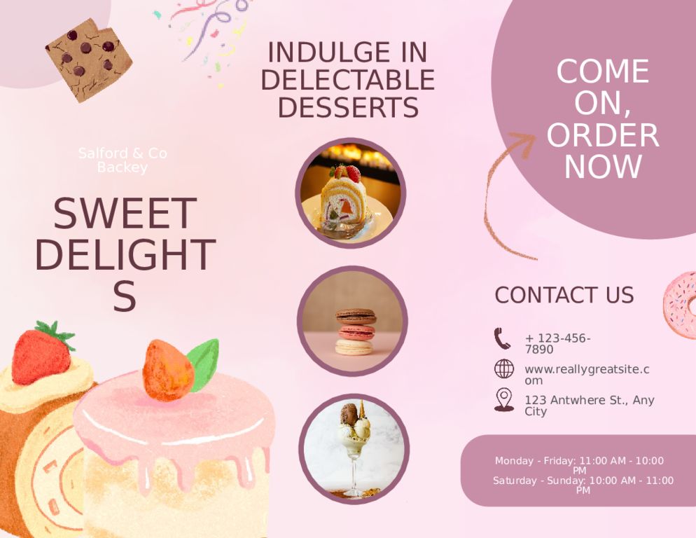 SWEET DELIGHTS INDULGE IN DELECTABLE DESSERTS Salford & Co Backey COME ON, ORDER NOW CONTACT US + 123-456-7890 www.reallygreatsite.com 123 Antwhere St., Any City Monday - Friday: 11:00 AM - 10:00 PM Saturday - Sunday: 10:00 AM - 11:00 PM