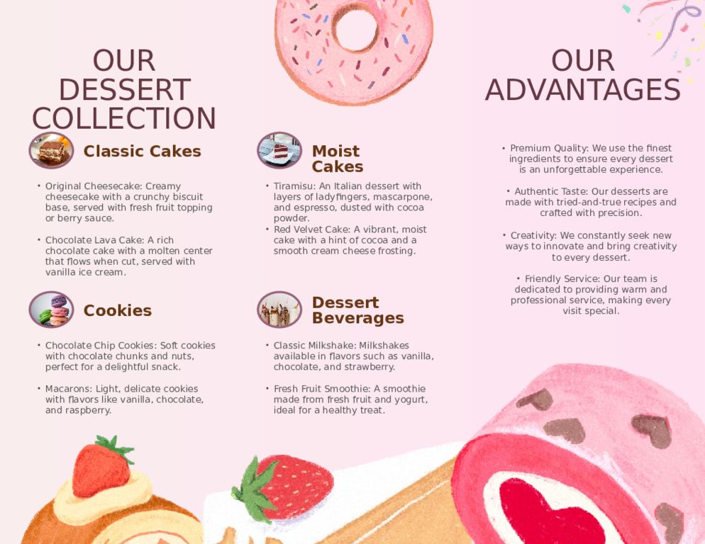 OUR DESSERT COLLECTION Classic Cakes Original Cheesecake: Creamy cheesecake with a crunchy biscuit base, served with fresh fruit topping or berry sauce. Chocolate Lava Cake: A rich chocolate cake with a molten center that flows when cut, served with vanilla ice cream. Cookies Chocolate Chip Cookies: Soft cookies with chocolate chunks and nuts, perfect for a delightful snack. Macarons: Light, delicate cookies with flavors like vanilla, chocolate, and raspberry. Moist Cakes Tiramisu: An Italian dessert with layers of ladyfingers, mascarpone, and espresso, dusted with cocoa powder. Red Velvet Cake: A vibrant, moist cake with a hint of cocoa and a smooth cream cheese frosting. Dessert Beverages Classic Milkshake: Milkshakes available in flavors such as vanilla, chocolate, and strawberry. Fresh Fruit Smoothie: A smoothie made from fresh fruit and yogurt, ideal for a healthy treat. OUR ADVANTAGES Premium Quality: We use the finest ingredients to ensure every dessert is an unforgettable experience. Authentic Taste: Our desserts are made with tried-and-true recipes and crafted with precision. Creativity: We constantly seek new ways to innovate and bring creativity to every dessert. Friendly Service: Our team is dedicated to providing warm and professional service, making every visit special.