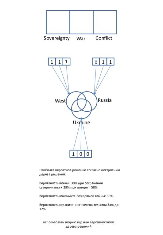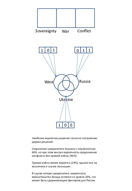 West Russia Ukraine 1 1 1 1 0 0 0 1 1 Sovereignty War Conflict Наиболее вероятное решение согласно построению дерева решений: Вероятность войны: 30% при сохранении суверенитета + 28% при потере = 58%. Вероятность конфликта без прямой войны: 30%. Вероятность ограниченного вмешательства Запада: 12% использовать теорию игр или вероятностного дерева решений