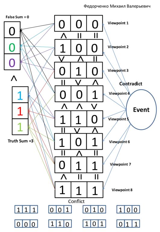 1 1 1 1 1 1 1 1 1 1 0 0 0 0 0 0 0 0 1 1 1 Event Contradict Truth Sum =3 > > = = > > > > > = > > = = > 0 0 0 > = = Viewpoint 1 Viewpoint 2 Viewpoint 3 Viewpoint 4 Viewpoint 5 Viewpoint 6 Viewpoint 8 0 0 0 False Sum = 0 Федорченко Михаил Валерьевич > Conflict 1 1 1 1 1 1 1 1 1 1 1 1 0 0 0 0 0 0 0 0 0 0 0 0 1 0 1 = = > Viewpoint 7