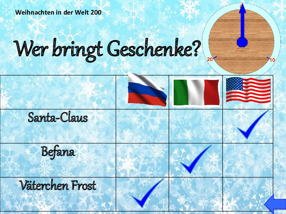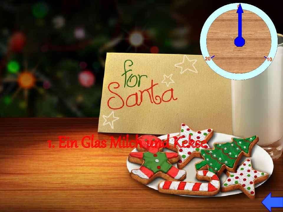 Weihnachten in der Welt 300 Welches „Geschenk“ lassen die amerikanischen Kinder am Vorabend Weihnachten für Santa Claus? 2. Mandarine und Schokolade 3. Eis und Praline 1. Ein Glas Milch und Kekse