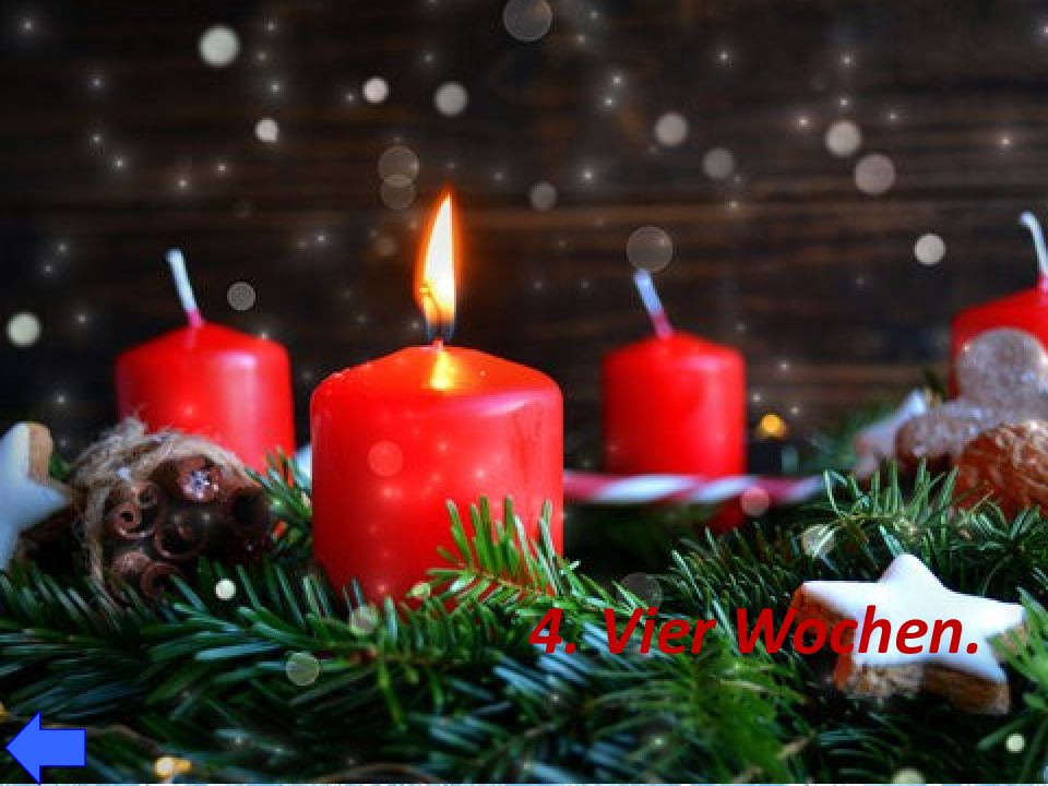 Wie lange dauert Advent? Weihnachten in Deutschland 100 1. Eine Woche. 2. Zwei Wochen. 3. Drei Wochen. 4. Vier Wochen.