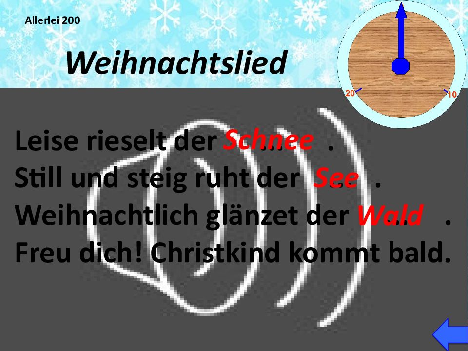 Allerlei 200 Leise rieselt der.... Still und steig ruht der.... Weihnachtlich glänzet der.... Freu dich! Christkind kommt bald. See Wald Schnee Weihnachtslied