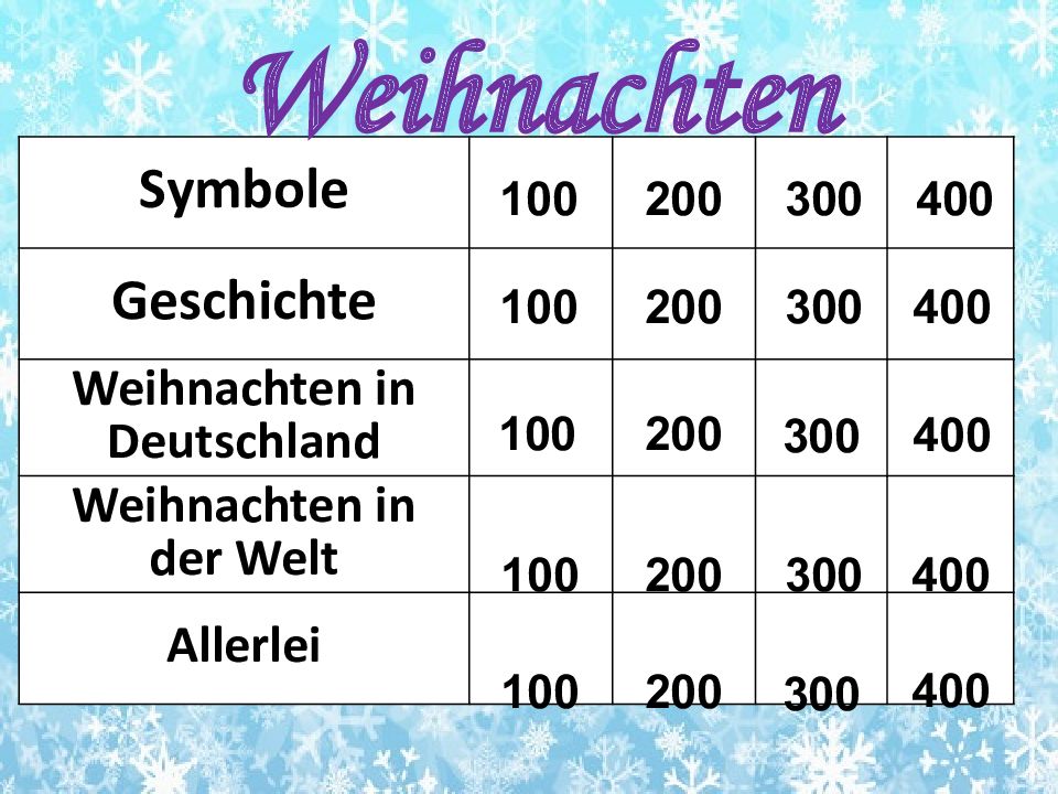Symbole Geschichte Weihnachten in Deutschland Weihnachten in der Welt Allerlei 100 100 300 400 400 300 200 100 100 300 300 400 400 Weihnachten 200 200 200 100 200 300 400