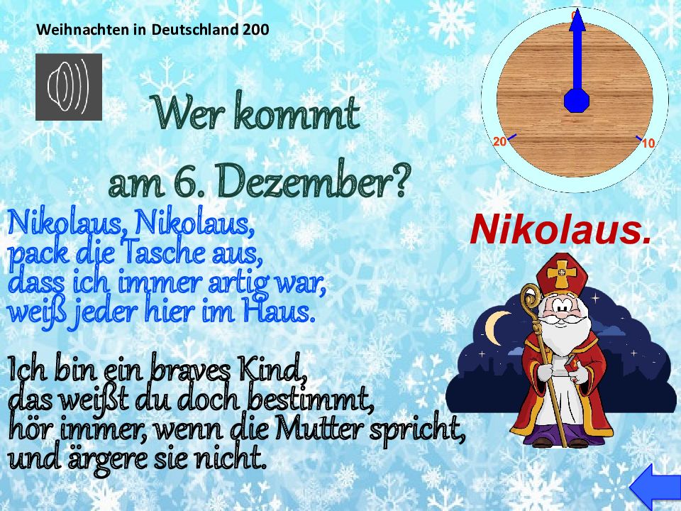 Weihnachten in Deutschland 200 Wer kommt am 6. Dezember? Nikolaus. Nikolaus, Nikolaus, pack die Tasche aus, dass ich immer artig war, weiß jeder hier im Haus. Ich bin ein braves Kind, das weißt du doch bestimmt, hör immer, wenn die Mutter spricht, und ärgere sie nicht.