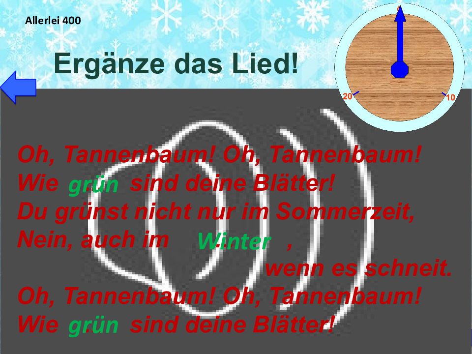 Allerlei 400 Ergänze das Lied! Oh, Tannenbaum! Oh, Tannenbaum! Wie... sind deine Blätter! Du grünst nicht nur im Sommerzeit, Nein, auch im..., wenn es schneit. Oh, Tannenbaum! Oh, Tannenbaum! Wie... sind deine Blätter! grün Winter grün