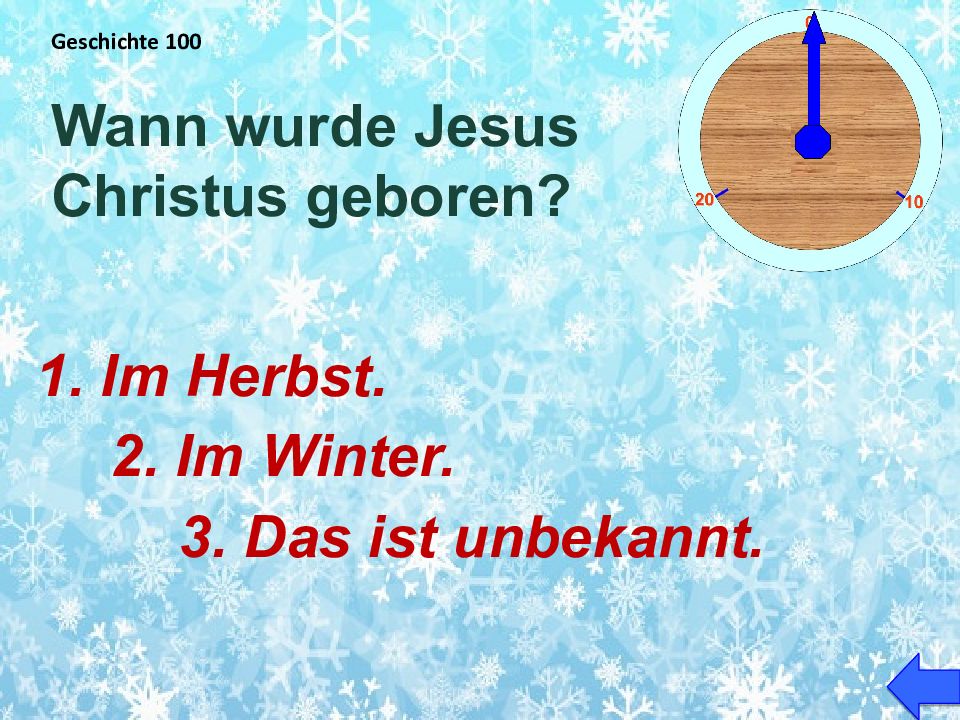 Geschichte 100 Wann wurde Jesus Christus geboren? 1. Im Herbst. 2. Im Winter. 3. Das ist unbekannt.