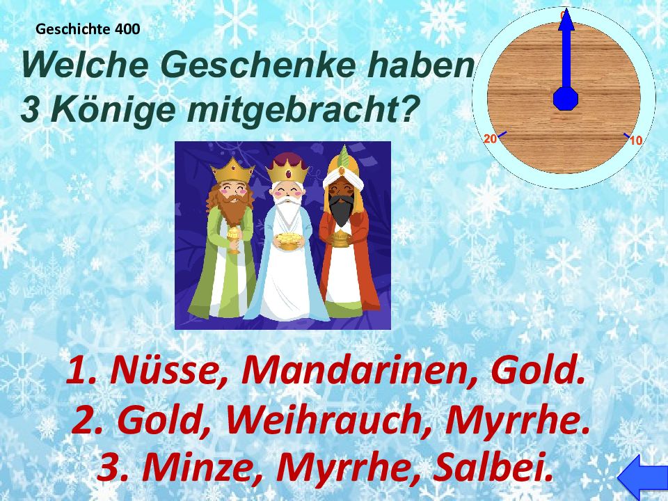 Geschichte 400 Welche Geschenke haben 3 Könige mitgebracht? 1. Nüsse, Mandarinen, Gold. 2. Gold, Weihrauch, Myrrhe. 3. Minze, Myrrhe, Salbei.