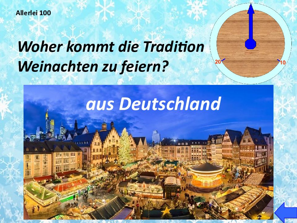 Woher kommt die Tradition Weinachten zu feiern? Aus England Aus Deutschland Aus Russland Aus Italien aus Deutschland Allerlei 100