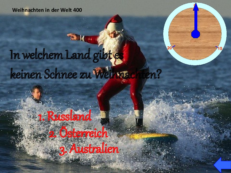 Weihnachten in der Welt 400 In welchem Land gibt es keinen Schnee zu Weihnachten? 1. Russland 2. Österreich 3. Australien