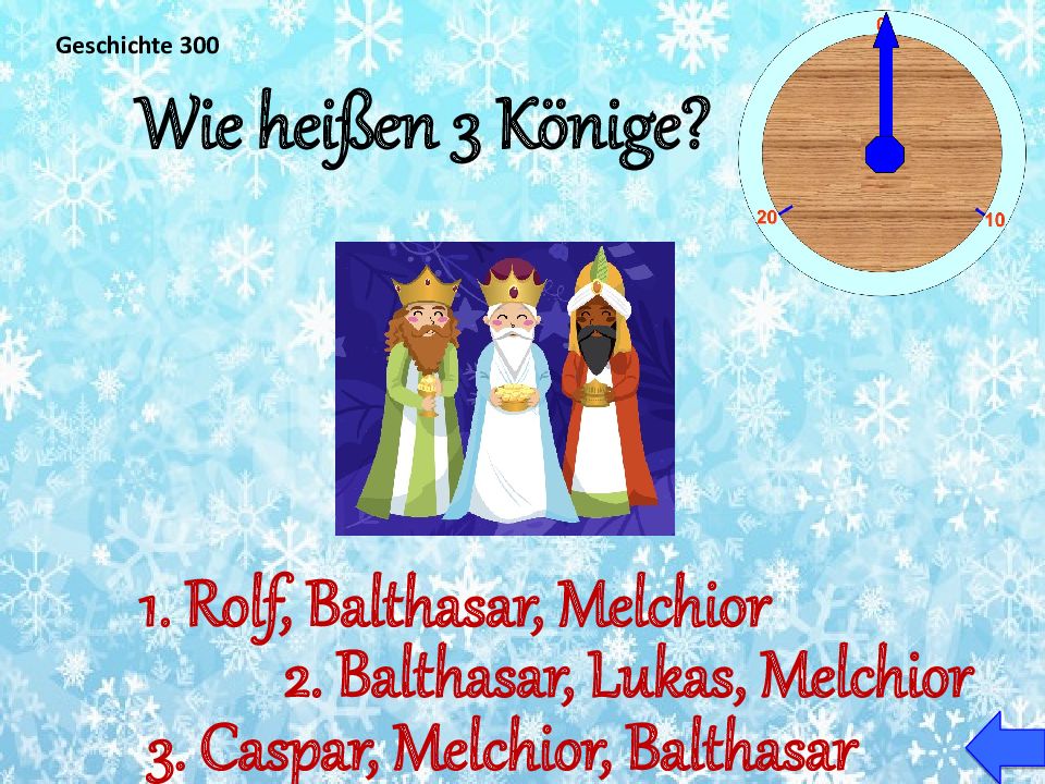 Geschichte 300 Wie heißen 3 Könige? 1. Rolf, Balthasar, Melchior 2. Balthasar, Lukas, Melchior 3. Caspar, Melchior, Balthasar