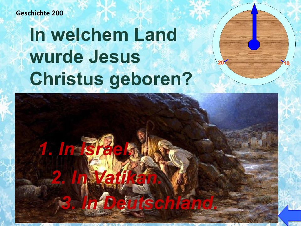 Geschichte 200 In welchem Land wurde Jesus Christus geboren? 1. In Israel. 2. In Vatikan. 3. In Deutschland.