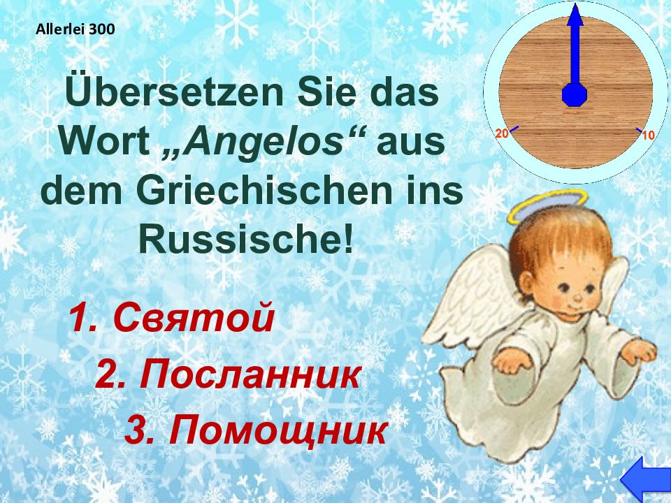 Allerlei 300 Übersetzen Sie das Wort „Angelos“ aus dem Griechischen ins Russische! 1. Святой 2. Посланник 3. Помощник