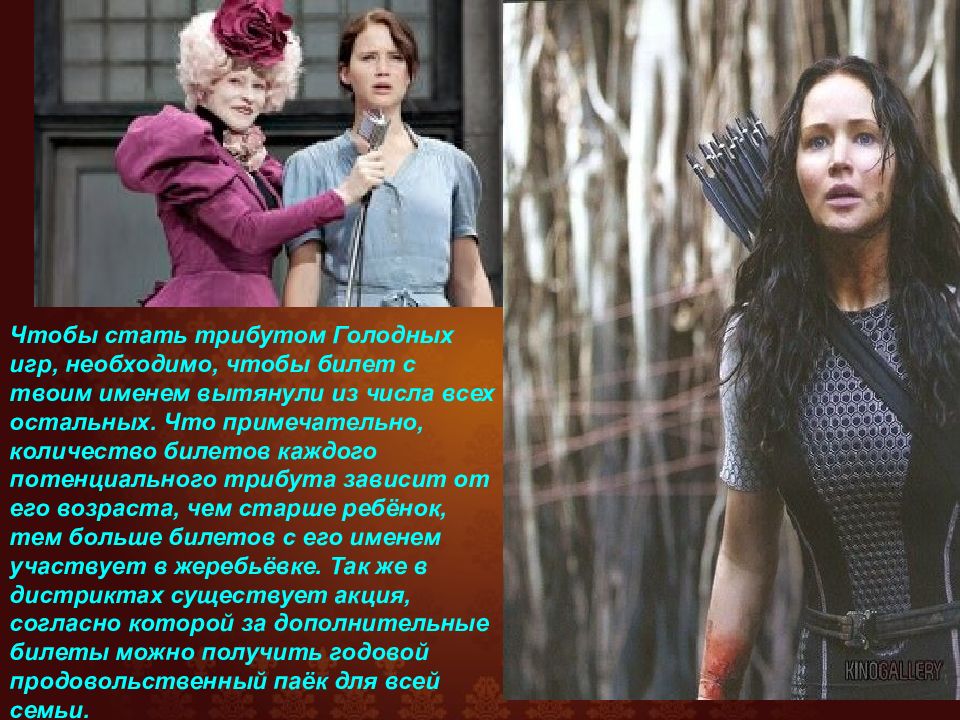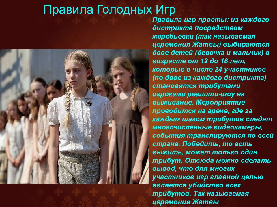 C:\Documents and Settings\User\Рабочий стол\img3.jpg Правила Голодных Игр Правила игр просты: из каждого дистрикта посредством жеребьёвки (так называемая церемония Жатвы) выбираются двое детей (девочка и мальчик) в возрасте от 12 до 18 лет, которые в числе 24 участников (по двое из каждого дистрикта) становятся трибутами игроками реалити-шоу на выживание. Мероприятие проводится на арене, где за каждым шагом трибутов следят многочисленные видеокамеры, события транслируются по всей стране. Победить, то есть выжить, может только один трибут. Отсюда можно сделать вывод, что для многих участников игр главной целью является убийство всех трибутов. Так называемая церемония Жатвы