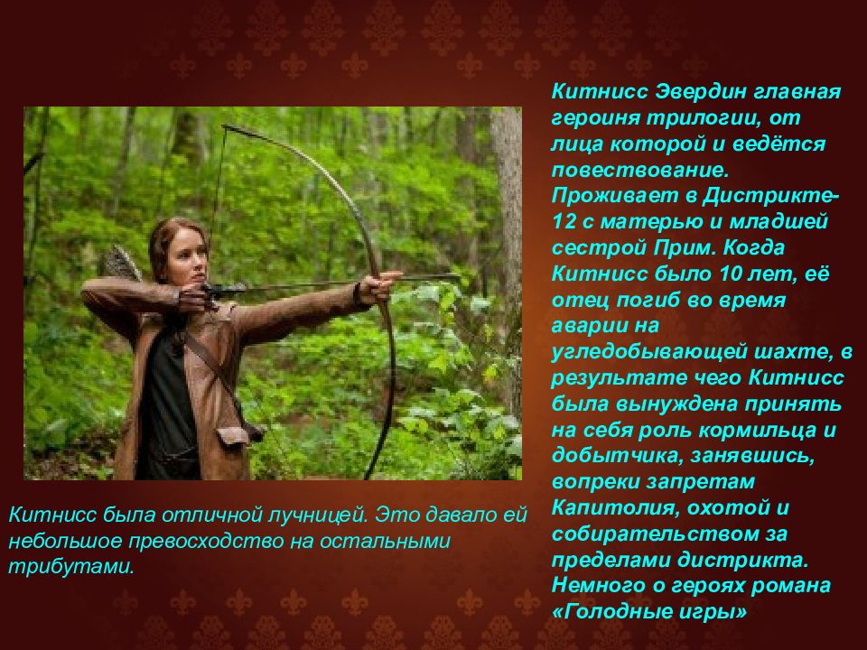 Китнисс была отличной лучницей. Это давало ей небольшое превосходство на остальными трибутами. Китнисс Эвердин главная героиня трилогии, от лица которой и ведётся повествование. Проживает в Дистрикте-12 с матерью и младшей сестрой Прим. Когда Китнисс было 10 лет, её отец погиб во время аварии на угледобывающей шахте, в результате чего Китнисс была вынуждена принять на себя роль кормильца и добытчика, занявшись, вопреки запретам Капитолия, охотой и собирательством за пределами дистрикта. Немного о героях романа «Голодные игры»