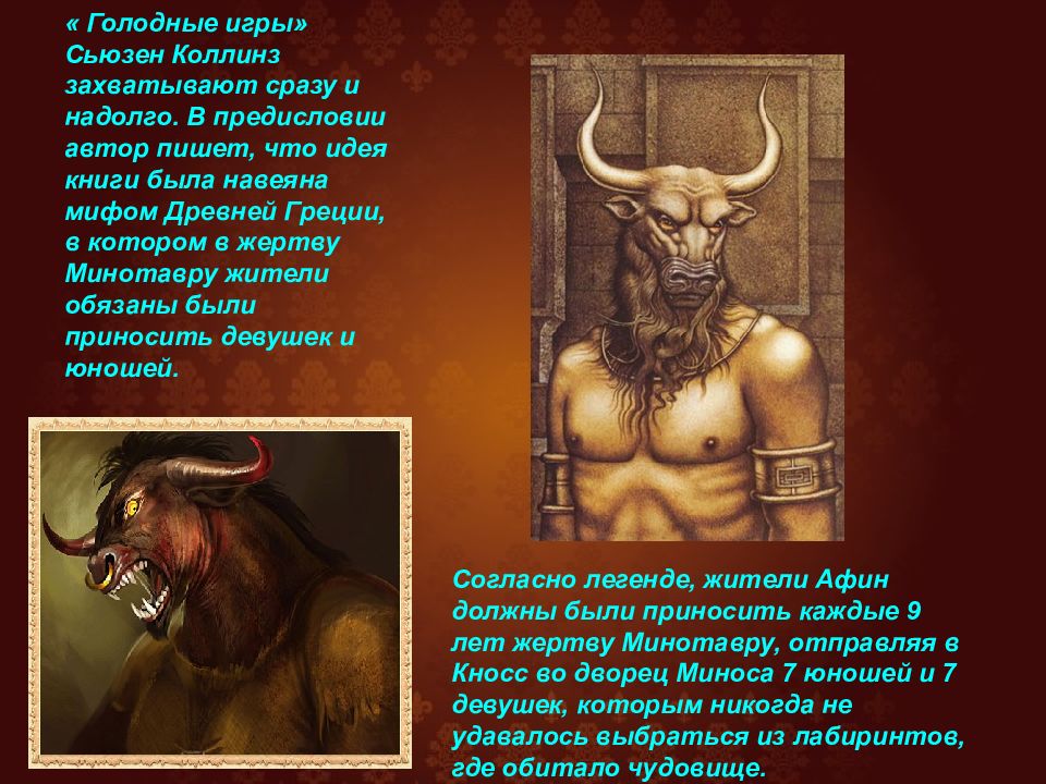 « Голодные игры» Сьюзен Коллинз захватывают сразу и надолго. В предисловии автор пишет, что идея книги была навеяна мифом Древней Греции, в котором в жертву Минотавру жители обязаны были приносить девушек и юношей. Согласно легенде, жители Афин должны были приносить каждые 9 лет жертву Минотавру, отправляя в Кносс во дворец Миноса 7 юношей и 7 девушек, которым никогда не удавалось выбраться из лабиринтов, где обитало чудовище.