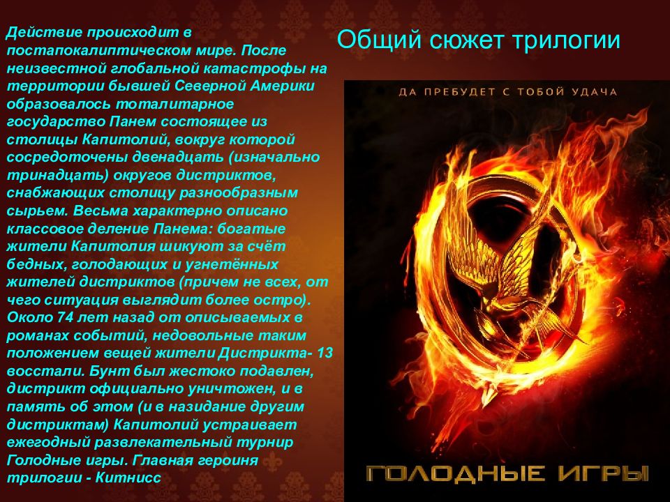 C:\Documents and Settings\User\Рабочий стол\cb0c860ba6dd9c0e2713f2c8b4d.jpg Общий сюжет трилогии Действие происходит в постапокалиптическом мире. После неизвестной глобальной катастрофы на территории бывшей Северной Америки образовалось тоталитарное государство Панем состоящее из столицы Капитолий, вокруг которой сосредоточены двенадцать (изначально тринадцать) округов дистриктов, снабжающих столицу разнообразным сырьем. Весьма характерно описано классовое деление Панема: богатые жители Капитолия шикуют за счёт бедных, голодающих и угнетённых жителей дистриктов (причем не всех, от чего ситуация выглядит более остро). Около 74 лет назад от описываемых в романах событий, недовольные таким положением вещей жители Дистрикта- 13 восстали. Бунт был жестоко подавлен, дистрикт официально уничтожен, и в память об этом (и в назидание другим дистриктам) Капитолий устраивает ежегодный развлекательный турнир Голодные игры. Главная героиня трилогии - Китнисс