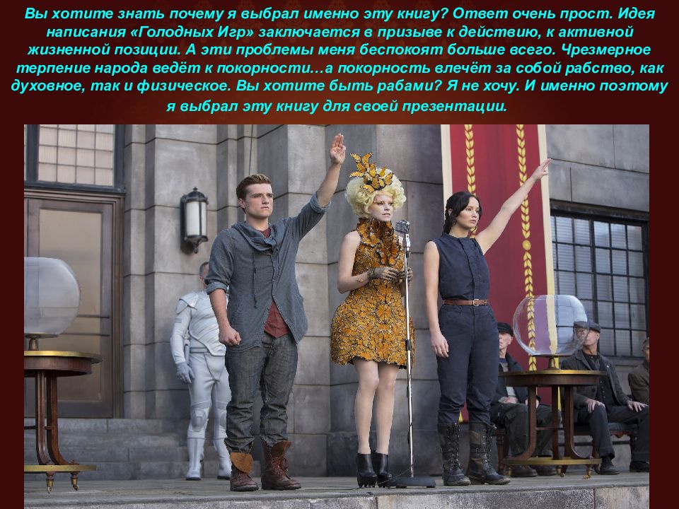Вы хотите знать почему я выбрал именно эту книгу? Ответ очень прост. Идея написания «Голодных Игр» заключается в призыве к действию, к активной жизненной позиции. А эти проблемы меня беспокоят больше всего. Чрезмерное терпение народа ведёт к покорности…а покорность влечёт за собой рабство, как духовное, так и физическое. Вы хотите быть рабами? Я не хочу. И именно поэтому я выбрал эту книгу для своей презентации.