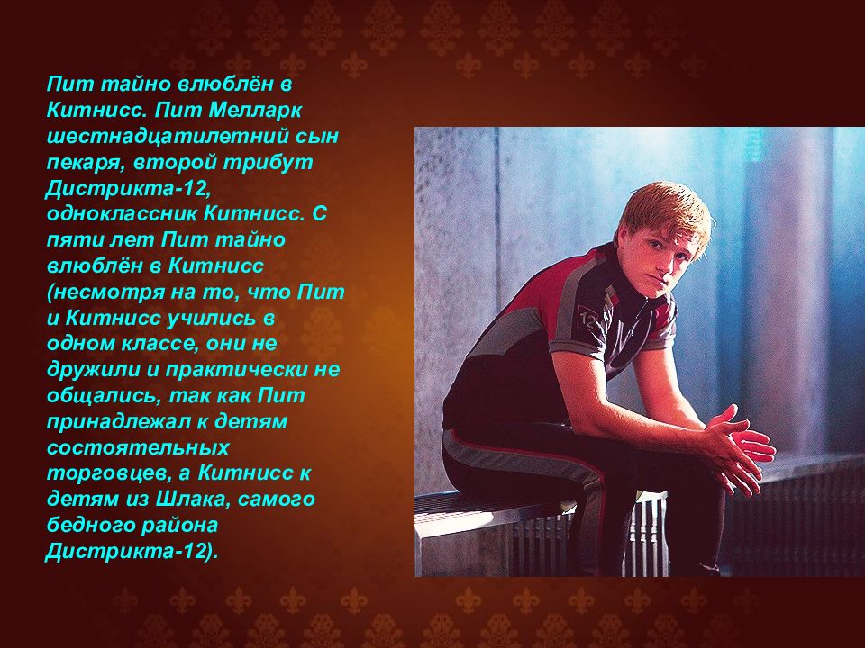 Пит тайно влюблён в Китнисс. Пит Мелларк шестнадцатилетний сын пекаря, второй трибут Дистрикта-12, одноклассник Китнисс. С пяти лет Пит тайно влюблён в Китнисс (несмотря на то, что Пит и Китнисс учились в одном классе, они не дружили и практически не общались, так как Пит принадлежал к детям состоятельных торговцев, а Китнисс к детям из Шлака, самого бедного района Дистрикта-12).