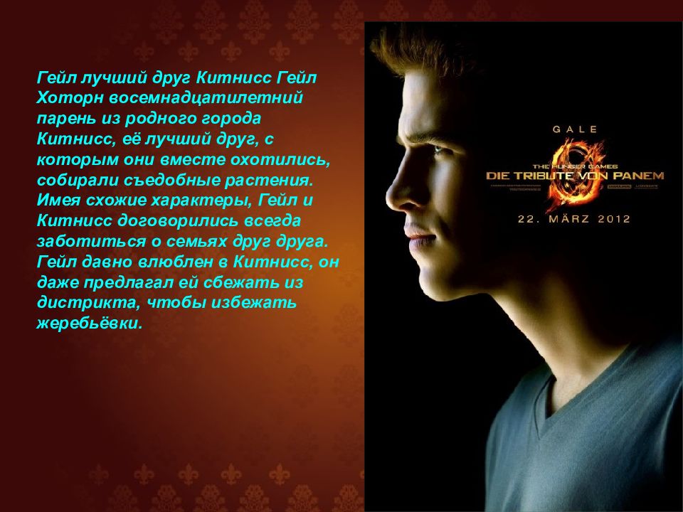 Гейл лучший друг Китнисс Гейл Хоторн восемнадцатилетний парень из родного города Китнисс, её лучший друг, с которым они вместе охотились, собирали съедобные растения. Имея схожие характеры, Гейл и Китнисс договорились всегда заботиться о семьях друг друга. Гейл давно влюблен в Китнисс, он даже предлагал ей сбежать из дистрикта, чтобы избежать жеребьёвки.