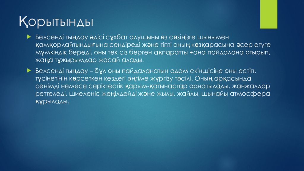 Белсенді тыңдау әдісі сұхбат алушыны өз сөзіңізге шынымен қамқорлайтындығына сендіреді және тіпті оның көзқарасына әсер етуге мүмкіндік береді, оны тек сіз берген ақпаратты ғана пайдалана отырып, жаңа тұжырымдар жасай алады. Белсенді тыңдау – бұл оны пайдаланатын адам екіншісіне оны естіп, түсінетінін көрсеткен кездегі әңгіме жүргізу тәсілі. Оның арқасында сенімді немесе серіктестік қарым-қатынастар орнатылады, жанжалдар реттеледі, шиеленіс жеңілдейді және жылы, жайлы, шынайы атмосфера құрылады.