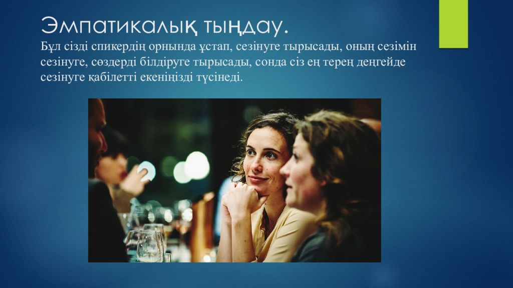 Слайд 7: Эмпатикалық тыңдау. Бұл сізді спикердің орнында ұстап, сезінуге тырысады, оның сезімін сезінуге, сөздерді білдіруге тырысады, сонда сіз ең терең деңгейде сезінуге қабілетті екеніңізді түсінеді