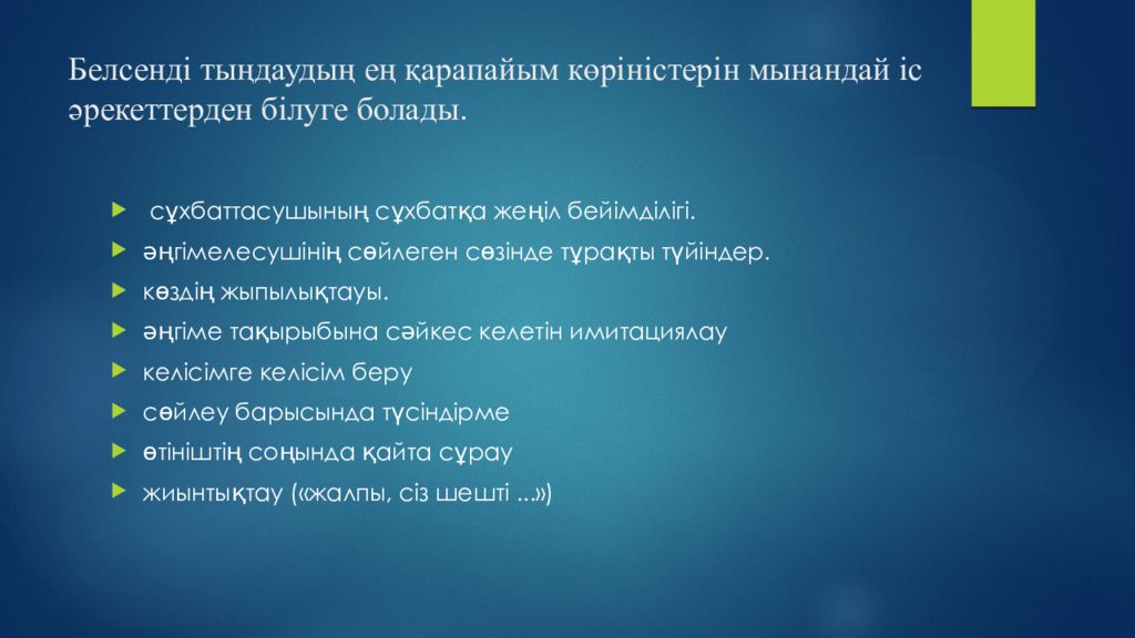 Слайд 8: Белсенді тыңдаудың ең қарапайым көріністерін мынандай іс әрекеттерден білуге болады