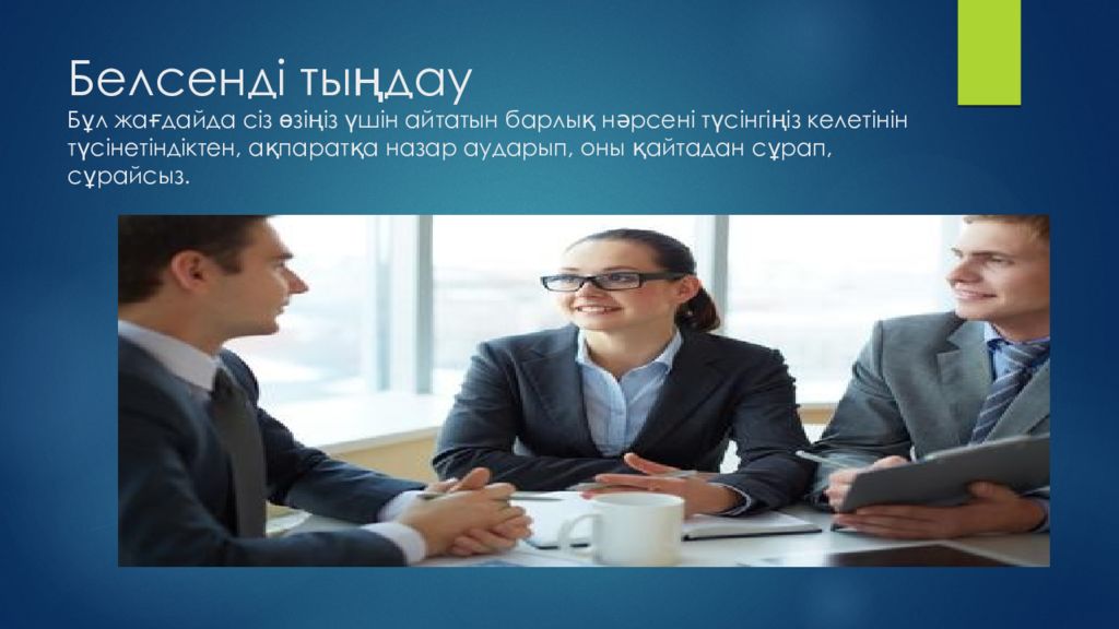 Слайд 5: Белсенді тыңдау Бұл жағдайда сіз өзіңіз үшін айтатын барлық нәрсені түсінгіңіз келетінін түсінетіндіктен, ақпаратқа назар аударып, оны қайтадан сұрап, сұрайсыз