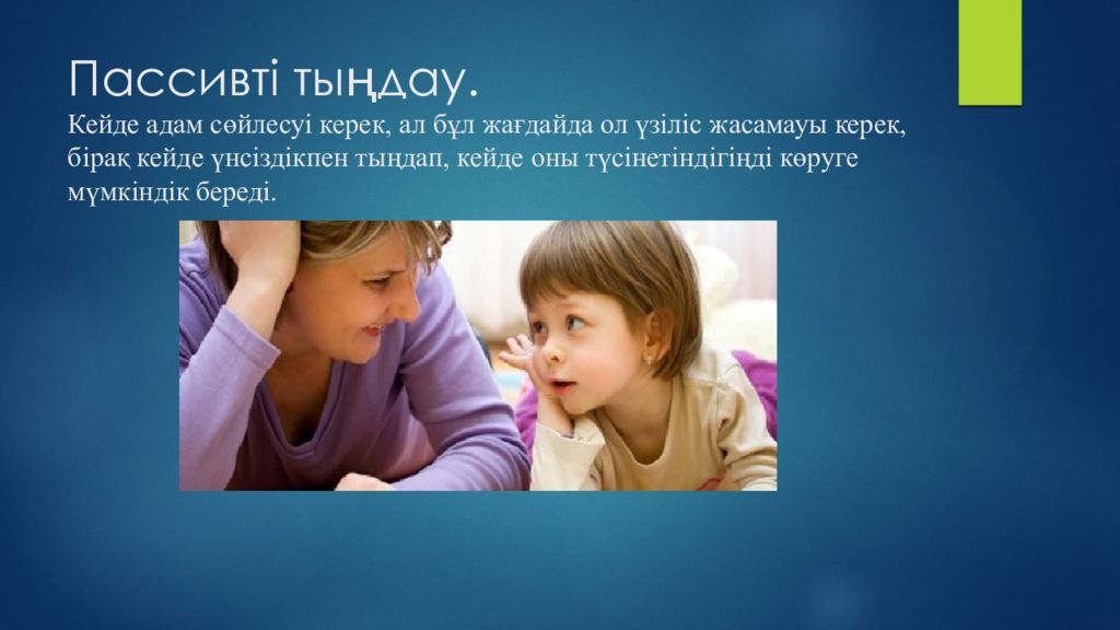 Слайд 6: Пассивті тыңдау. Кейде адам сөйлесуі керек, ал бұл жағдайда ол үзіліс жасамауы керек, бірақ кейде үнсіздікпен тыңдап, кейде оны түсінетіндігіңді көруге мүмкіндік береді