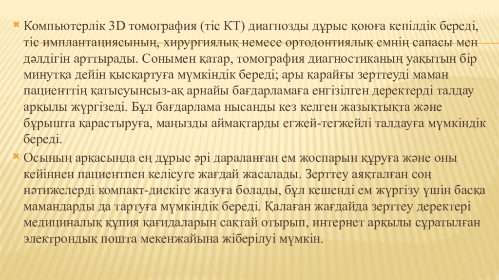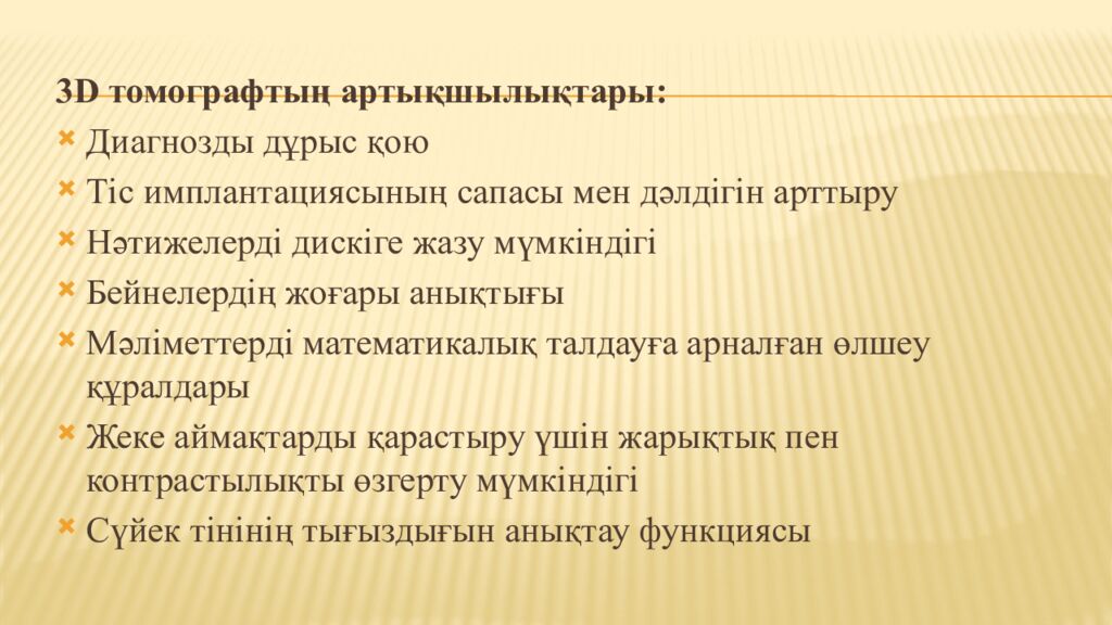 3D томографтың артықшылықтары : Диагнозды дұрыс қою Тіс имплантациясының сапасы мен дәлдігін арттыру Нәтижелерді дискіге жазу мүмкіндігі Бейнелердің жоғары анықтығы Мәліметтерді математикалық талдауға арналған өлшеу құралдары Жеке аймақтарды қарастыру үшін жарықтық пен контрастылықты өзгерту мүмкіндігі Сүйек тінінің тығыздығын анықтау функциясы