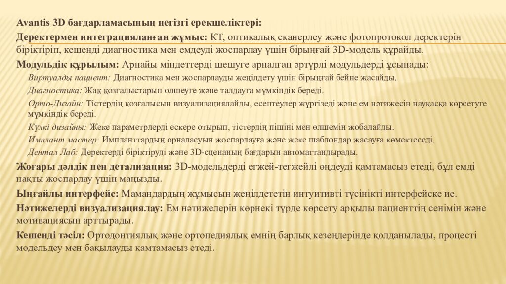 Avantis 3D бағдарламасының негізгі ерекшеліктері : Деректермен интеграцияланған жұмыс : КТ, оптикалық сканерлеу және фотопротокол деректерін біріктіріп, кешенді диагностика мен емдеуді жоспарлау үшін бірыңғай 3 D- модель құрайды. Модульдік құрылым : Арнайы міндеттерді шешуге арналған әртүрлі модульдерді ұсынады : Виртуалды пациент: Диагностика мен жоспарлауды жеңілдету үшін бірыңғай бейне жасайды. Диагностика: Жақ қозғалыстарын өлшеуге және талдауға мүмкіндік береді. Орто-Дизайн: Тістердің қозғалысын визуализациялайды, есептеулер жүргізеді және ем нәтижесін науқасқа көрсетуге мүмкіндік береді. Күлкі дизайны: Жеке параметрлерді ескере отырып, тістердің пішіні мен өлшемін жобалайды. Имплант мастер: Импланттардың орналасуын жоспарлауға және жеке шаблондар жасауға көмектеседі. Дентал Лаб: Деректерді біріктіруді және 3 D- сценаның бағдарын автоматтандырады. Жоғары дәлдік пен детализация: 3 D- модельдерді егжей-тегжейлі өңдеуді қамтамасыз етеді, бұл емді нақты жоспарлау үшін маңызды. Ыңғайлы интерфейс: Мамандардың жұмысын жеңілдететін интуитивті түсінікті интерфейске ие. Нәтижелерді визуализациялау : Ем нәтижелерін көрнекі түрде көрсету арқылы пациенттің сенімін және мотивациясын арттырады. Кешенді тәсіл : Ортодонтиялық және ортопедиялық емнің барлық кезеңдерінде қолданылады, процесті модельдеу мен бақылауды қамтамасыз етеді.