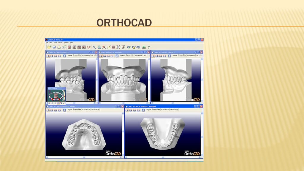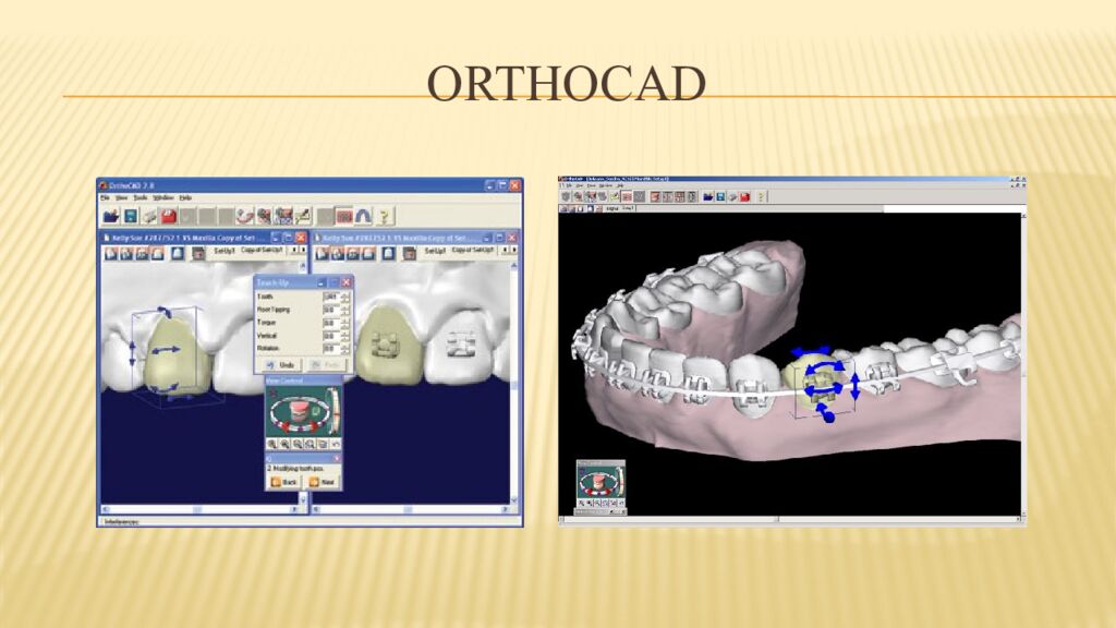 OrthoCAD – арнайы ортодонтияға арналған бағдарламалық жасақтама, оның функционалы кіріс деректерін өңдеуге және олардың негізінде тіс қатары элементтерінің анатомиялық құрылым ерекшеліктеріне толық сәйкес келетін брекеттерді автоматты түрде модельдеуге мүмкіндік береді. Негізінде, бұл жүйе бұрын стоматологтар қолмен орындайтын тапсырмалар тізімін жүзеге асырады. Мұндай « делегирлеу » қол жеткізілетін нәтижені жақсартады, өйткені бағдарлама құрастырған модель замочкаларды қайта орналастыруды, күштік доғаны түзетуді және қалпына келтіру циклін баяулататын басқа да түзетулерді қажет етпейді. Техникалық тұрғыдан алғанда, америкалық OrthoCAD жүйесін қолдану үш кезеңді қамтиды : Жақ бөлімі анатомиясын қайталайтын үшөлшемді модельді қалыптастыру, оны құру үшін iCast құралдар жиынтығы қолданылады. Virtual Setup құралдарының көмегімен алынған виртуалды прототипті диагностикалау, ол құрылым ерекшеліктері мен дамуындағы маңызды жайттарды көрсетеді. Тікелей емес фиксация әдісімен орнатылатын IQ аппараттық модулі арқылы каппаларды жасау. Дайындық кезеңіндегі негізгі міндеттерді цифрлық сегментке көшіру алдын ала циклді едәуір жеңілдетеді және дәрігерлерге тіс қатарының ақауларын диагностикалау мен емдеуде жаңа мүмкіндіктер ашады.