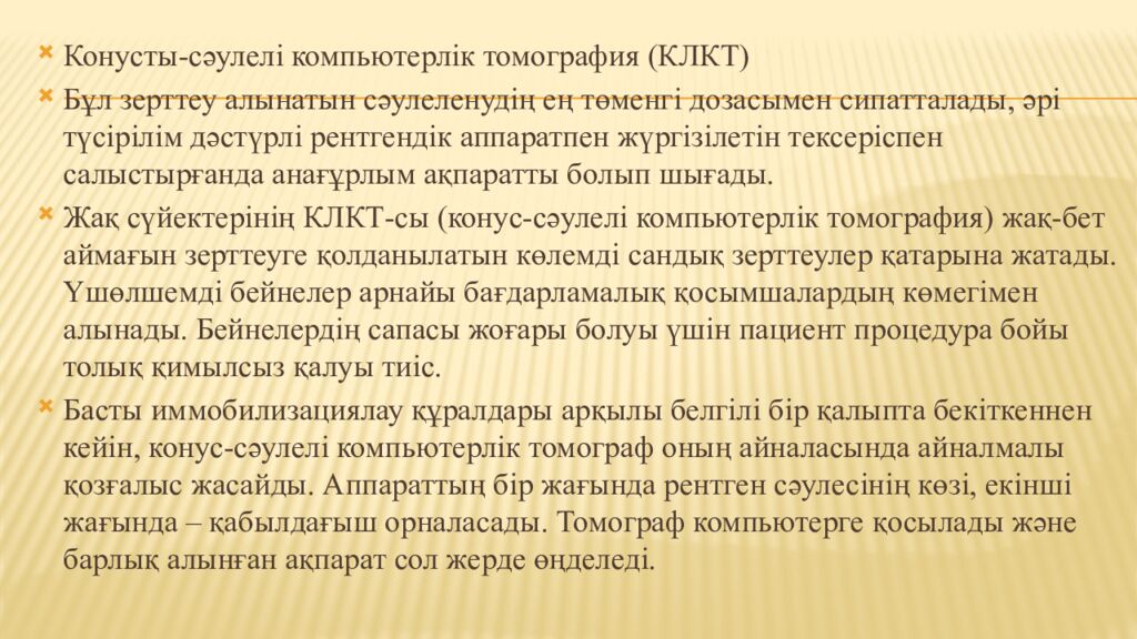 Конусты-сәулелі компьютерлік томография (КЛКТ) Бұл зерттеу алынатын сәулеленудің ең төменгі дозасымен сипатталады, әрі түсірілім дәстүрлі рентгендік аппаратпен жүргізілетін тексеріспен салыстырғанда анағұрлым ақпаратты болып шығады. Жақ сүйектерінің КЛКТ- сы (конус- сәулелі компьютерлік томография) жақ -бет аймағын зерттеуге қолданылатын көлемді сандық зерттеулер қатарына жатады. Үшөлшемді бейнелер арнайы бағдарламалық қосымшалардың көмегімен алынады. Бейнелердің сапасы жоғары болуы үшін пациент процедура бойы толық қимылсыз қалуы тиіс. Басты иммобилизациялау құралдары арқылы белгілі бір қалыпта бекіткеннен кейін, конус- сәулелі компьютерлік томограф оның айналасында айналмалы қозғалыс жасайды. Аппараттың бір жағында рентген сәулесінің көзі, екінші жағында – қабылдағыш орналасады. Томограф компьютерге қосылады және барлық алынған ақпарат сол жерде өңделеді.